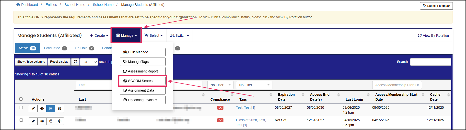 ![Manage student by rotation table highlighting manage dropdown and SCROM scores button.